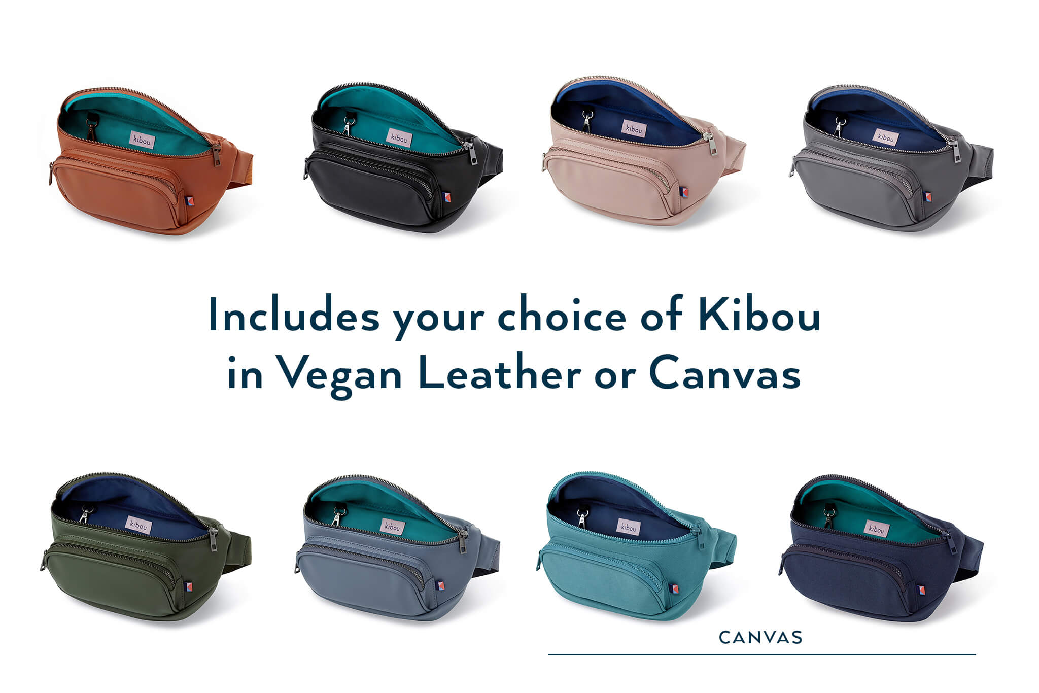 Our vegan leather & canvas fanny packs are designed to sit comfortably on your waist or cross body. Kibou is the bag that does life with you--keeping all you need by your side, hands-free.